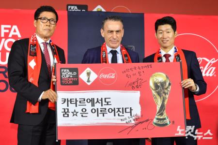 24일 오후 서울 여의도 더현대 서울에서 열린 FIFA 월드컵 2022 트로피 투어에서 차범근 전 감독과 파울루 벤투 대한민국 축구 국가대표팀 감독과 박지성 전 대한민국 축구 국가대표가 기념촬영을 하고 있다.