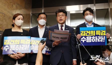 더불어민주당 진성준 원내수석부대표가 7일 서울 여의도 국회에서 열린 의원총회를 마치고 윤석열 대통령 부인 김건희 여사의 주가 조작, 허위경력, 뇌물성 후원 사건 등의 진상규명을 골자로한 '김건희 특검법' 발의와 관련한 브리핑을 하고 있다.