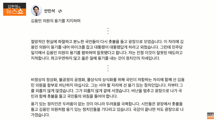 ◇ 김현정> 고맙습니다. 안 의원님 관련해서 최근에 떠들썩했던 이슈부터 하나 먼저 좀 질문드리고 갈게요. 민주당 김용민 의원이 윤석열 대통령 퇴진 집회에서 빨리 퇴진할 수 있게 해야 된다 이런 발언을 해서 논란이 있었는데 안민석 의원이 지지 입장을 공개적으로 밝히셨어요.