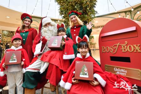 8일 오전 서울 중구 롯데백화점 본점에서 로바니에미 산타마을에서 온 핀란드 공식 산타와 엘프가 아이들과 함께 기념촬영을 하고 있다. 이번 행사는 크리스마스 시즌을 앞두고 12월 8일부터 17일까지 본점, 잠실점, 인천점 등 24개 점포에서 순차적으로 진행할 예정이며, 문화센터 회원 어린이 고객을 대상으로 사전 접수한 30명의 아이들과 함께 진행한다.