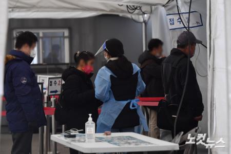 정부가 실내 마스크 착용 해제를 검토하고 있는 가운데 코로나19가 다시 증가세를 보이고 있는 12일 오후 서울 중구 서울역 임시선별검사소에 시민들이 코로나19 검사를 받기 위해 대기하고 있다. 이날 신규 확진자 수는 2만5천명대를 기록했으며 월요일 기준으로 13주 만에 가장 많다.