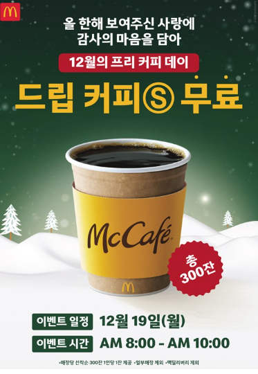 맥도날드는 19일 오전 8시부터 10시까지 제품 구매 여부에 상관없이 전국의 모든 매장을 방문하는 고객에게 따뜻한 스몰 사이즈 드립 커피를 무료로 제공한다. 커피는 맥도날드 매장 계산대와 드라이브 스루(DT)에서 제공되며 각 매장당 300잔에 한해 선착순으로 증정한다.
