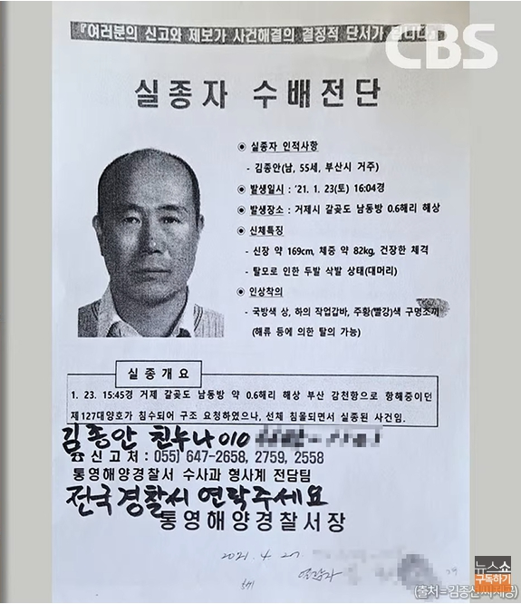 ◆ 김종선> 네, 부산시청 수산정책과에서 처음에 전화를 하고 그다음에 해양에서, 거제 해양경찰서에서 전화를 할 수 있는 이유는 의무적으로 만약에 엄마가 살아 있으면 우리 동생이 나이는 57인데 결혼을 하지 않았거든요.