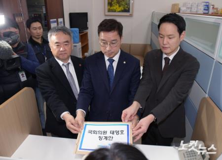 더불어민주당 위성곤 수석부대표(가운데) 송재호, 김한규 의원이 15일 오전 국회 의안과에서 태영호 의원에 대한 윤리위 징계안 제출을 하고 있다. 탈북자 출신으로 이번 최고위원 선거에 나선 태영호 의원은 첫 지역 합동연설회가 열렸던 제주에서"4·3 사건은 김일성 일가에 의해 자행된 만행"이라는 주장을 내놓으면서 논란을 빚고 있다.
