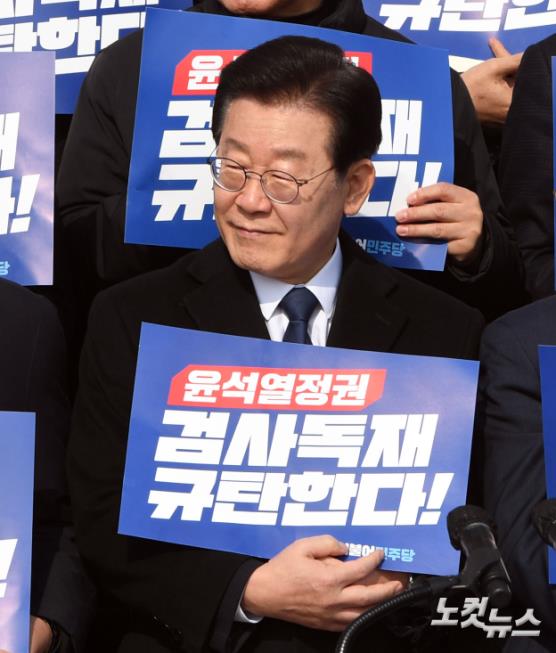 더불어민주당 이재명 대표가 17일 오전 국회 본관 앞에서 열린 ‘윤석열 정권 검사독재 규탄대회’ 에 참석해 구호를 외치고 있다.