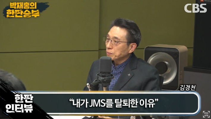 ◇ 박재홍> CBS 라디오 <박재홍의 한판승부>, 2부 문을 열었습니다. JMS, 아가동산, 오대양, 만민중앙교회 등 최근 사이비종교 문제를 다룬 넷플릭스 시리즈 다큐 <나는 신이다>가 공개된 후 후폭풍이 되게 거센 상황이죠. 그중에서도 도를 넘는 성착취와 폭력성, 정명석의 폭력성에 모두 경악을 금치 못하고 있는 상황인데요. JMS가 우리 사회 곳곳에 퍼져 있다. 심지어는 사회 고위직, 각종 고위 기관에 그 JMS 신도가 있어서 비호세력으로 작용하고 있다라는 기사도 나오고 있죠. 그래서 오늘 이 시간에는 전 JMS 초창기 멤버이자 부총재였다가 탈출을 하셨고요. 이제 가나안이라는 JMS 피해자 모임 카페를 만드셔서 또 돕고 계신 분입니다. 안산상록교회 김경천 목사를 모셨습니다. 목사님, 어서 오십시오.