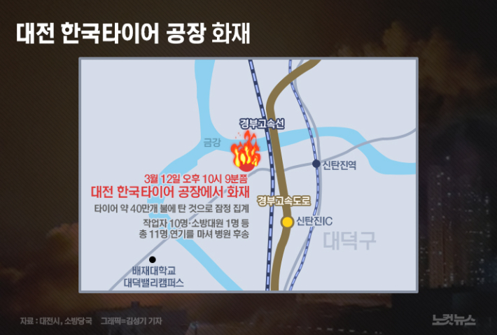 한국타이어 대전공장 화재 현장. 대전소방본부 제공한국타이어 대전공장에서 발생한 화재가 12시간 넘게 이어지는 가운데 인근 지역 학교들이 학생들의 안전을 위해 등교를 중지하거나 등교시간을 조정조치 했다. 소방당국은 화재 진화를 위해 헬기 9대를 동원하는 등 가용 장비를 총동원 했다.