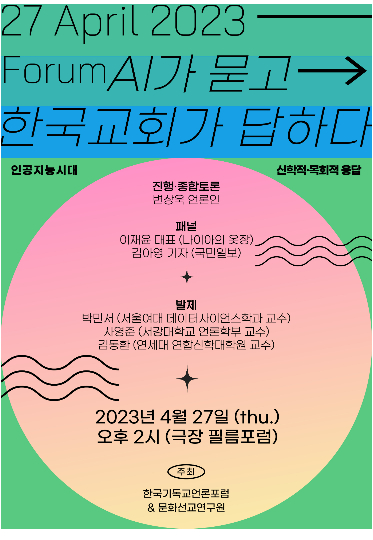 한국기독교언론포럼과 문화선교연구원도 인공지능시대에 대한 문화포럼을 마련한다. "AI가 묻고, 한국교회가 답하다"를 제목으로 열리는 문화포럼은 인공지능기술이 무엇인지 개념의 이해부터 시작해, 이에 대한 신학적 평가, 목회적 조망과 실천을 진단할 계획이다.