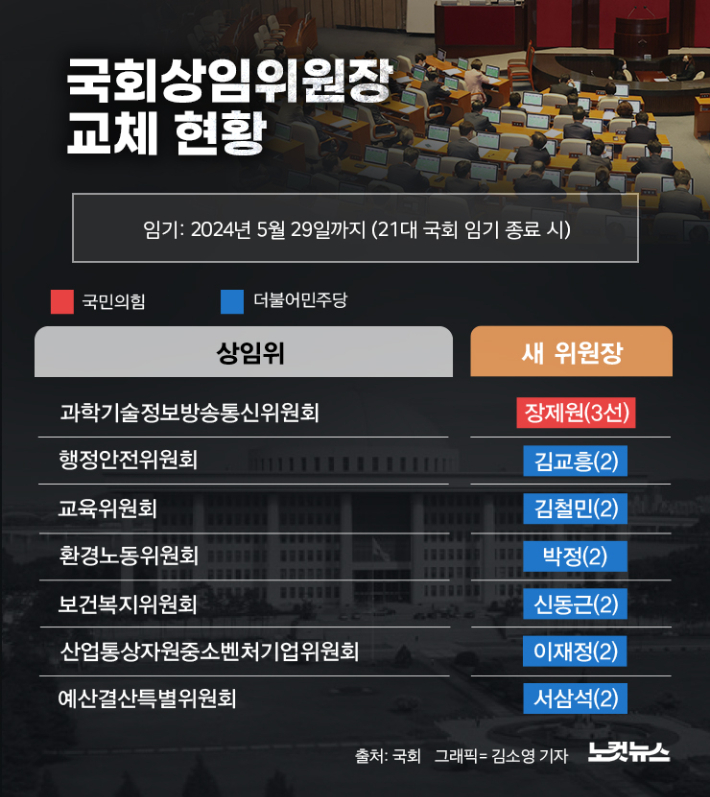 민주당은 14일 본회의를 열고 △김철민 교육위원장 △김교흥 행정안전위원장 △이재정 산업통상자원중소벤처기업위원장 △신동근 보건복지위원장 △박정 환경노동위원장 △서삼석 예산결산특별위원장을 각각 선출했다. 이소영 원내대변인은 선출 배경에 대해 "전문성과 지역 특성, 본인 희망 등을 종합적으로 고려했다"며 "모두 의정활동 경험이 풍부하고 21개 국회에서 간사 등 역할을 한 분들이라 현안에 대한 기민한 대응이 기대된다"고 설명했다.