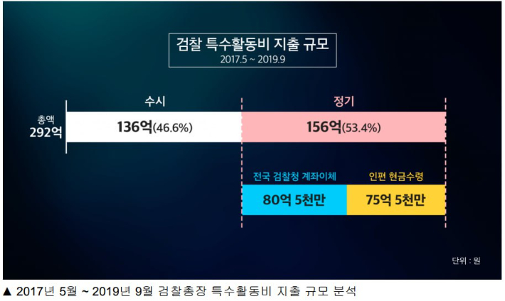◆ 하승수> 일단 292억 중에 54% 정도 되는 156억은 정기적으로 돈이 나가더라고요. 그 156억 중에 80억 원은 일선 검찰청에 나가는 거니까 그래도 그거는 어느 정도 돈이 흐름이 드러난다고 볼 수 있는데 정기적으로 나가는 156억 중에서도 75억 정도는 특정한 15명 정도의 사람들이 현금으로 찾아가는 걸로 돼 있습니다. 매달 초에.