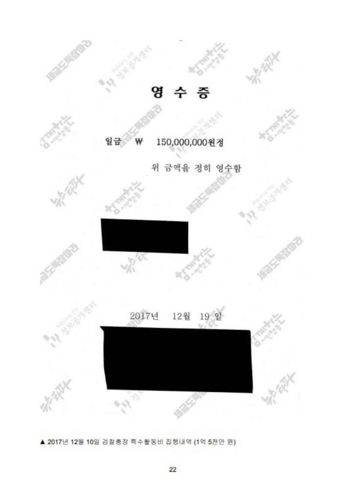 ◆ 하승수> 그리고 검찰총장이 임의로 쓸 수 있는 136억 정도가 있는데 그 돈 중에 상당수가 아까 제가 흥청망청이라고 표현했습니다만 우리 국민들 눈높이에 봤을 때는 좀 이해가 안 되는 방식으로 썼고요. 지금 보시는 것처럼 예를 들면 2017년 12월 19일에 1억 5000만 원이 저렇게 현금 수령증 한 장만 남기고 누군가가 받아간 걸로 돼 있습니다.
