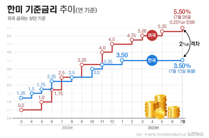 미국의 소비자물가상승률이 둔화세를 보이고 있지만 해당 지표가 다시 상승할 가능성이 있으며, 현실화되면 '9월 추가 금리 인상론'에 힘이 실리며 시장 긴장이 번지고 안전자산인 달러 강세가 되살아날 수 있다는 것이다. 이럴 경우 수입 물가 상승·금융 시장 불안으로 이어질 수 있기에 환율 방어 차원에서 추가 기준금리 인상 가능성을 배제할 수 없다는 논리다.