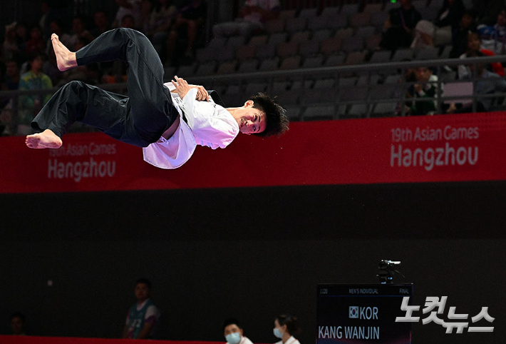 대한민국 선수단 첫 금메달을 획득한 태권도품새 국가대표 강완진이 24일 오후 중국 항저우 린안 스포츠문화전시센터에서 열린 '2022 항저우 아시안게임' 태권도 품새 개인전 금메달을 확정지은 후 세리머니 하고 있다.