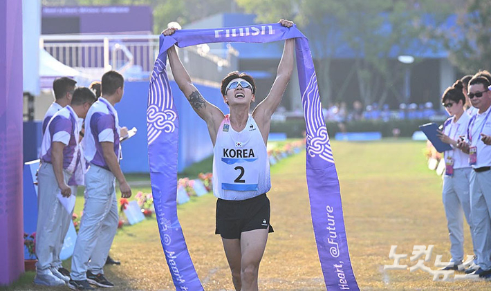 24일 중국 항저우 푸양 인후 스포츠센터에서 열린 '2022 항저우 아시안게임' 근대5종 남자 개인전에서 결승선을 통과한 전웅태가 환호하고 있다. 전웅태는 남자 개인전에서 총점 1508점으로 금메달을 목에 걸었고, 국가별 상위 3명의 점수를 합산해 메달 색을 결정하는 단체전에서도 이지훈, 정진화와 함께 금메달을 목에 걸어 이번 대회 한국 선수단 첫 2관왕에 올랐다.
