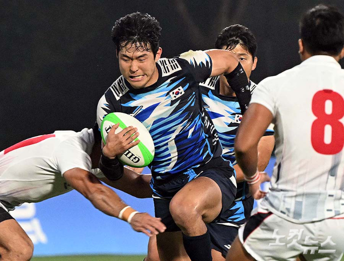 26일 중국 항저우 사범대에서 열린 '2022 항저우 아시안게임' 7인제 럭비 결승전에서 한국 정연식이 홍콩 수비를 뚫고 있다. 이날 경기에서 7-14로 패한 럭비 대표팀은 2006 도하 대회 이후 17년 만에 은메달을 획득했다.