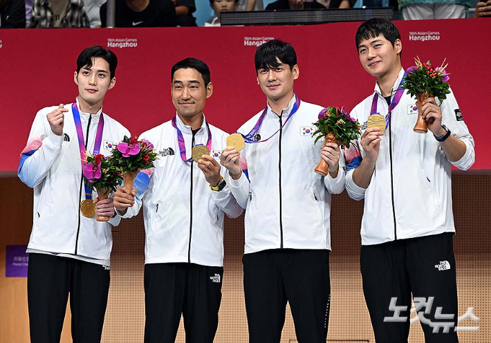 28일 중국 항저우 전자대학에서 열린 '2022 항저우 아시안게임' 남자 사브르 단체 결승전에서 금메달을 획득한 사브르 대표팀 김준호(왼쪽부터), 김정환, 구본길, 오상욱이 금메달을 들어보이고 있다. 이날 구본길은 개인 통산 6번째 금메달을 걸며 역대 최다 아시안게임 최다 타이 기록을 세웠고 오상욱은 개인전에 이어 대회 2관왕에 등극했다.