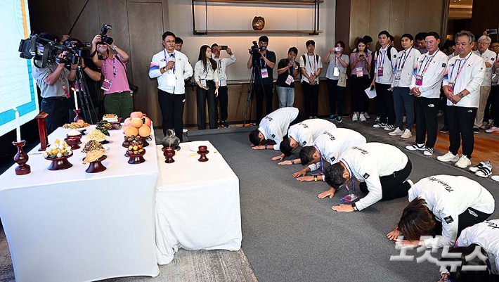 민족 대명절 추석인 29일 중국 항저우 시내 한 호텔에 마련된 대한체육회 스포츠외교라운지에서 이기흥 대한체육회장, 최윤 선수단장을 비롯한 선수단이 합동차례를 지내고 있다.