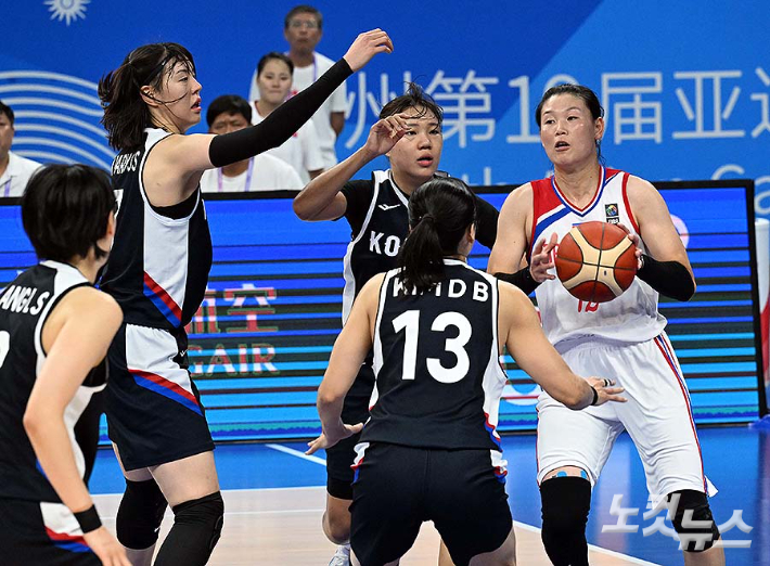 민족 대명절 추석인 29일 오후 중국 항저우 올림픽 스포츠센터에서 열린 '2022 항저우아시안게임' 여자농구 조별리그 C조 경기 한국과 북한의 경기에서 북한 로숙영이 한국 박지수와 박지현의 수비를 뚫으려 하고 있다. 박지수, 박지현, 로숙영은 '2018 자카르타-팔렘방 아시안게임' 에서 남북단일팀 멤버로 활약해 은메달을 합작했다.