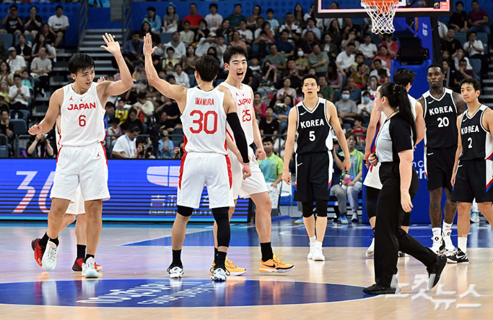 30일 중국 항저우 올림픽 스포츠센터에서 열린 '2022 항저우아시안게임' 남자농구 조별리그 D조 경기 한국과 일본의 경기에서 83 대 77 로 승리한 일본 선수들이 환호하고 있다. 일본은 이번 대회 대표팀에 지난달 열린 국제농구연맹(FIBA) 월드컵 멤버가 1명도 포함되지 않았다. 사실상 2진급 선수들로 대표팀을 꾸렸다.