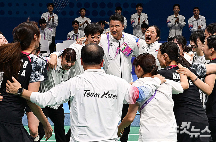 1일 중국 항저우 빈장체육관에서 '2022 항저우 아시안게임' 배드민턴 여자 단체전에서 승리한 한구 선수들이 환호하고 있다. 대표팀은 이날 열린 여자 단체전 결승에서 중국을 게임 스코어 3-0으로 완파하고 금메달을 차지했다. 아시안게임 배드민턴 여자 단체전 우승은 1994년 히로시마 대회 이후 29년 만이자 역대 2번째다.