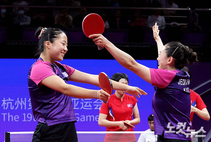 탁구 국가대표 신유빈-전지희 조가 2일 중국 항저우 궁수 캐널 스포츠파크 체육관에서 열린 '2022 항저우 아시안게임' 탁구 여자 복식 결승전에서 북한 차수영-박수경 조를 만나 금메달을 확정지은 후 기뻐하고 있다. 신유빈과 전지희는 2002년 부산 아시안게임 석은미-이은실 이후 21년 만에 여자 복식에서 금메달을 목에 건 선수가 됐다.
