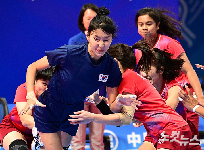 2일 중국 항저우 샤오산스포츠센터에서 열린 '2022 항저우 아시안게임' 카바디 여자 조별리그 A조 1경기 한국과 태국의 경기에서 우희준이 공격을 시도하고 있다. 우희준은 미스코리아 출신이자 특전자 출신이라는 이색적인 이력으로 국내는 물론 해외에서도 많은 주목을 받았다.