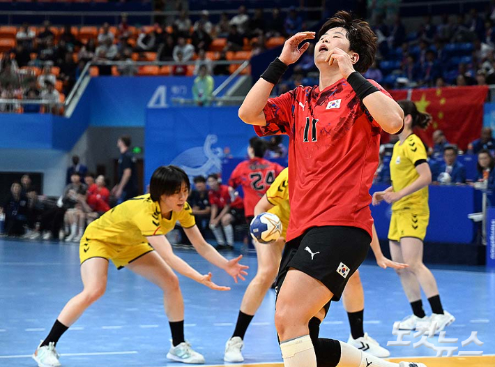 핸드볼 대표팀 류은희가 5일 중국 항저우 저장 궁상대 스포츠센터에서 열린 '2022 항저우 아시안게임' 여자 핸드볼 결승 일본과의 경기에 출전해 공격이 막히자 얼굴을 감싸고 있다. 핸드볼 대표팀은 이날 결승에서 일본에 19 대 29 패배를 당해 아시안게임 3연패가 무산됐다.