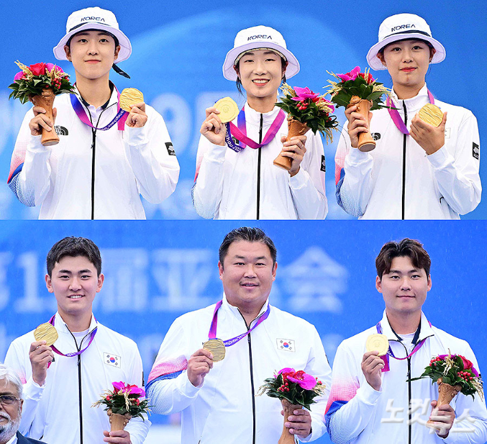 이우석, 오진혁, 김제덕이 뭉친 대표팀은 6일 중국 항저우 푸양 인후 스포츠센터 양궁장에서 열린 '2022 항저우 아시안게임' 결승에서 인도를 5 대 1로 제압해 2010년 광저우 대회 이후 13년 만에 정상에 올랐다. 앞서 열린 앞서 여자 단체 경기에서는 임시현, 최미선, 안산이 금메달을 따내 아시안게임 단체전 7연패를 달성했다.
