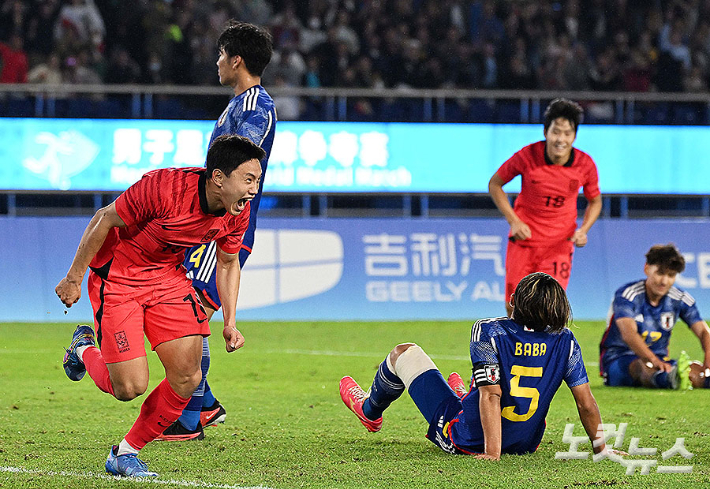 7일 중국 항저우 황룽 스포츠센터 스타디움에서 열린 2022 항저우 아시안게임 남자축구 대한민국과 일본의 결승전에서 역전골을 성공시킨 조영욱이 기뻐하고 있다. 이날 대표팀은 일본을 2 대 1로 제압했다. 2014년 인천 대회와 2018년 자카르타-팔렘방 대회에서 2회 연속 우승을 거둔 한국은 이번 대회에서 3연패의 대업을 이뤘다.
