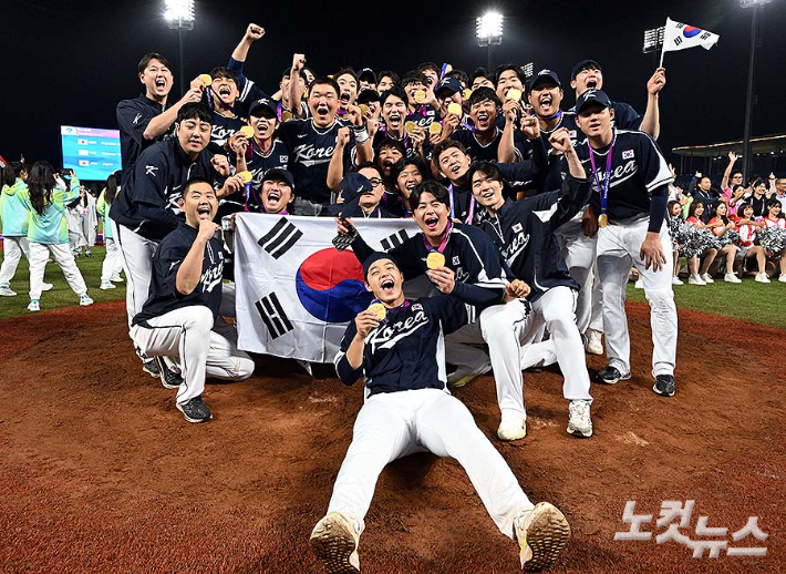 7일 중국 항저우 인근 사오싱 야구·소프트볼 스포츠센터에서 열린 '2022 항저우 아시안게임' 야구 결승에서 대만을 꺾고 금메달을 차지한 대표팀이 마운드에서 기념촬영 하고 있다. 이날 대표팀은 선발 투수 문동주의 눈부신 역투를 앞세워 대만을 2-0으로 제압하고 2010 광저우, 2014 인천, 2018 자카르타·팔렘방 대회에 이어 아시안게임 4연패를 이뤘다.