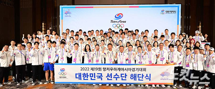 8일 중국 항저우의 한 호텔에서 열린 2022 항저우 아시안게임 대한민국 선수단 해단식에서 이기흥 대한체육회장, 최윤 선수단장 및 선수들이 기념촬영을 하고 있다. 우리나라는 금메달 42개, 은메달 59개, 동메달 89개로 메달 순위 3위에 올랐다.