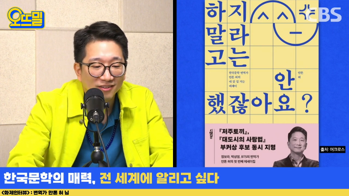 ◇ 채선아> 화제의 인터뷰 시간입니다. 오늘은 번역계 화제의 인물을 모셨는데요. BTS의 책을 번역해서 뉴욕타임스 베스트셀러 1위에 올랐고요. 작년에는 세계 3대 문학상 중 하나인 부커상 인터내셔널 부문, 그리고 올해는 전미도서상 번역 부문 최종 후보에 작품을 올린 분이죠. 그야말로 전 세계에 한국 문학을 알리고 계신 분입니다. 번역가 안톤 허 님 모셨습니다.