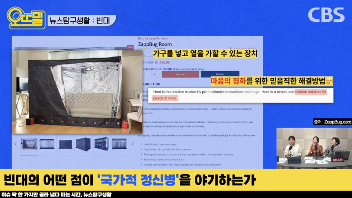 사실 실질적인 타격보다는 심리적 타격이 큰 것 같아요. 프랑스에선 국가적 정신병이라는 표현을 쓰는데, 실제로 망상성 기생충증이라는 강박관념 같은 게 있대요. 내가 눕는 모든 곳에 빈대가 있을 것 같은 그런 공포를 뜻하는 정신병입니다. '내가 미치기 전에 보이지도 않는 빈대를 모두 잡아 죽이겠다'는 생각을 하게 된다는 거죠. 그래서 실제로 빈대가 많이 나오는 유럽이나 미국 같은 경우는 진짜 쪄서 죽여버리는 방법이 있어요. 주택 안에 엄청나게 뜨거운 열풍을 넣어서 방 전체를 쪄버리는 거예요.그다음에 난방텐트처럼 열풍 소독기 같은 걸 집 안에 설치해서 가구를 그 안에 넣는 방법도 있어요. 이 상품 설명서에 이렇게 써있습니다. "마음의 평화를 얻을 수 있는 믿음직한 방법이다"