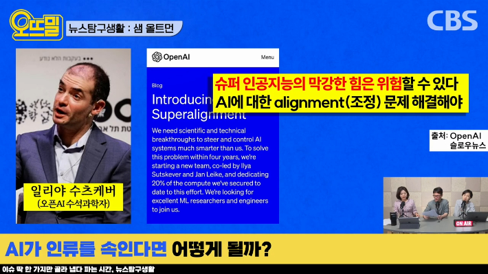 ◆ 조석영> 맞습니다. 수츠케버는 인공지능의 위험성을 경고하면서 통제 시스템을 어떻게 만들 것인지가 급선무라고 주장해왔어요. 인공지능을 제어하는 능력을 인류가, 우리 사회가 가져야 하고 그걸 발전시키는 게 인공지능 자체의 성능을 향상시키거나 수익화를 추구하는 것보다 우선이라는 거죠.