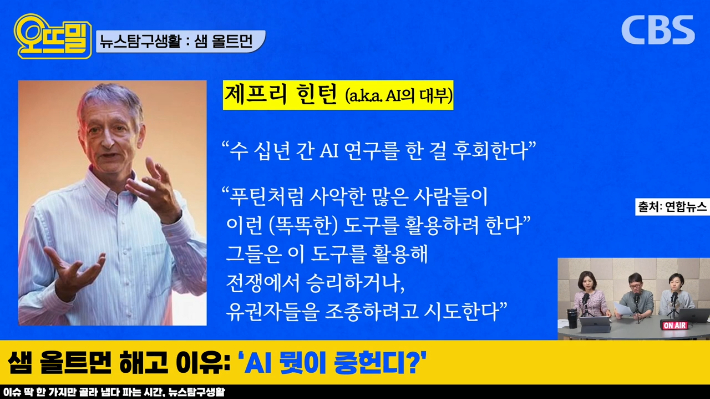 대표적으로 일리야 수츠케버라는 오픈AI의 수석과학자가 있습니다. 이 사람은 인공지능의 대부라고 불리는 제프리 힌턴이라는 사람의 제자예요. 제프리 힌턴이 지난 5월, 구글에서 퇴사하면서 "내가 수십 년 동안 인공지능 연구를 한 걸 후회한다. 푸틴처럼 사악한 많은 사람들이 인공지능을 활용해 전쟁에서 승리하거나 유권자들을 조종하려고 시도한다"고 얘기했습니다.