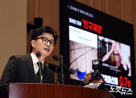 한동훈 법무부 장관이 6일 오후 국회에서 열린 국민의힘 정책의원총회에 참석해 출입국·이민관리청 신설 방안에 대해 설명하고 있다.