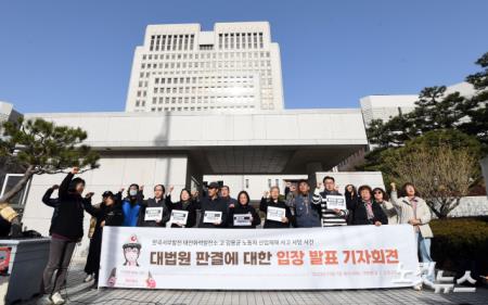 대법원이 2018년 한국서부발전 태안화력발전소에서 발생한 고(故) 김용균씨 사망 사고와 관련해 재판에 넘겨진 김병숙 전 한국서부발전 대표에게 무죄를 확정지은 7일 오전 서울 서초구 대법원 앞에서 김용균 씨 어머니 김미숙 김용균재단 대표가 기자회견을 갖고 있다.