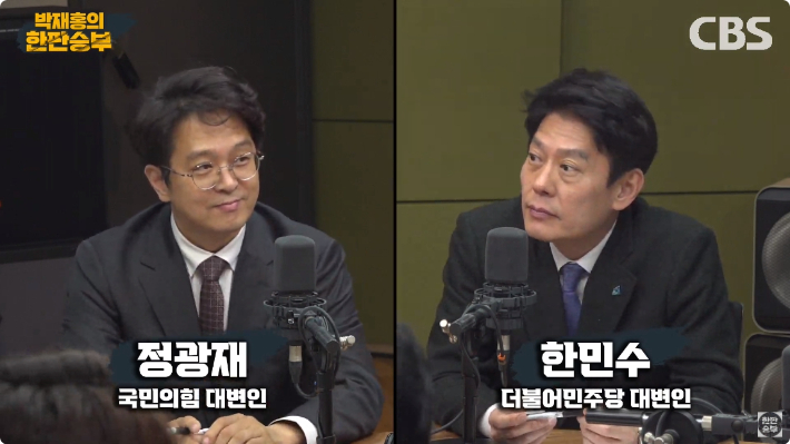 ◇ 박재홍> 오늘도 굉장히 뜨거웠는데요. 시간상 여기서 마무리를 해야 될 것 같습니다. 함께해 주신 분 정광재 국민의힘 대변인, 한민수 더불어민주당 대변인 두 분 고맙습니다.