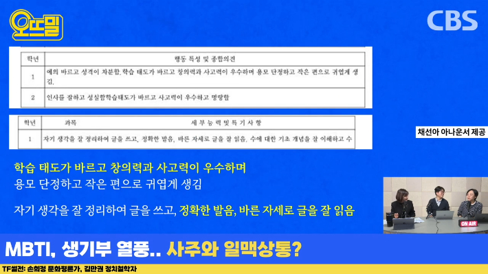 ◇ 채선아> 저희가 MBTI를 이렇게 좋아하지만, 얼마 전엔 생활기록부를 떼보는 게 유행이었어요.