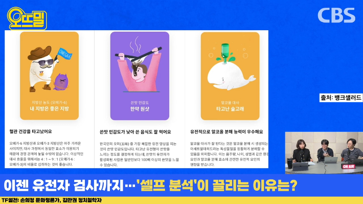 ◆ 김만권> 이 불안의 시대에 가장 확실한 것들을 찾아가는 것들 성향들이 있는데 그중에 가장 대표적인 게 이 유전자 검사가 아닌가라는 생각이 들어요. 또 건강에 대한 관심도 높아지고 있고 이런 상황에서 유전자 검사가 비용은 들어가지만, 그 비용을 치른 만큼 우리한테 자기 자신이 누군지 파악하고 자기를 관리하는 데 도움이 되는 거죠, 그래서 이런 것들이 유행하는 게 그렇게 나쁜가라는 생각이 들 때가 있어요.
