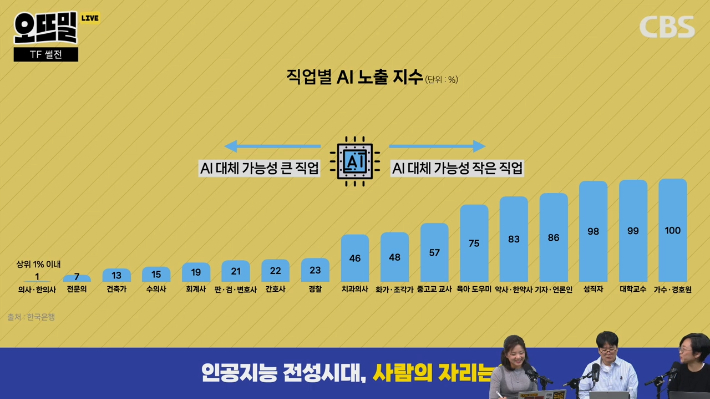 ◆ 김만권> 범위를 좀 넓히면 390만 개 정도까지 간다는 얘기를 하더라고요. 그중에서도 의사나 한의사 쪽은 대체될 수 있는 수준이 거의 상위 1% 이내에 든다고 하거든요.