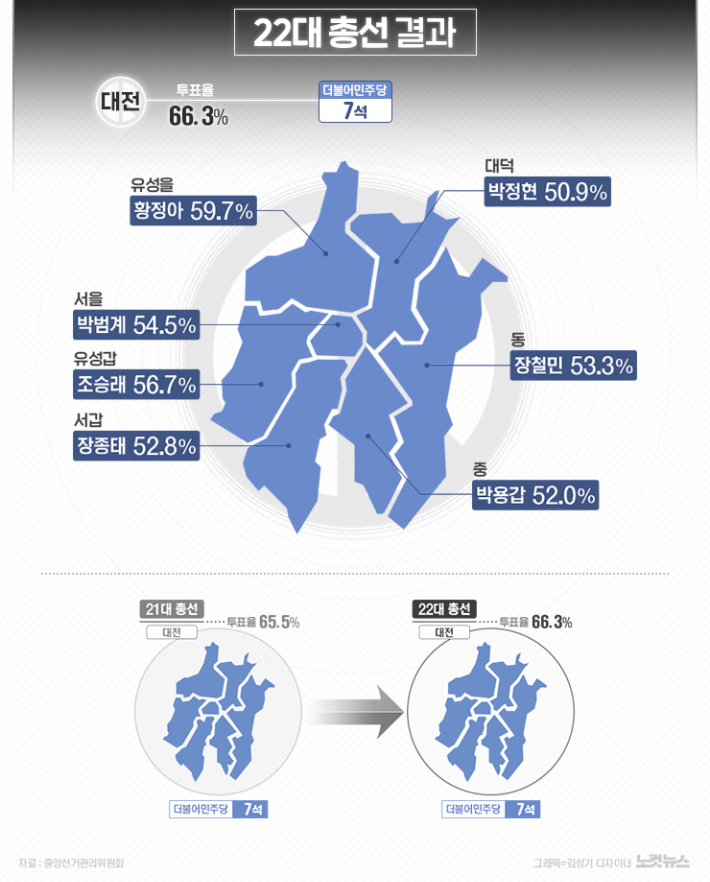 21대 국회의 경우 민주당은 동구 장철민, 중구 황운하, 서구갑 박병석, 서구을 박범계, 유성갑 조승래, 유성을 이상민, 대덕 박영순 의원이 활동한데 이어 22대 국회에서는 동구 장철민, 중구 박용갑, 서구갑 장종태, 서구을 박범계, 유성갑 조승래, 유성을 황정아, 대덕 박정현 의원 등이 활동하게 된다.