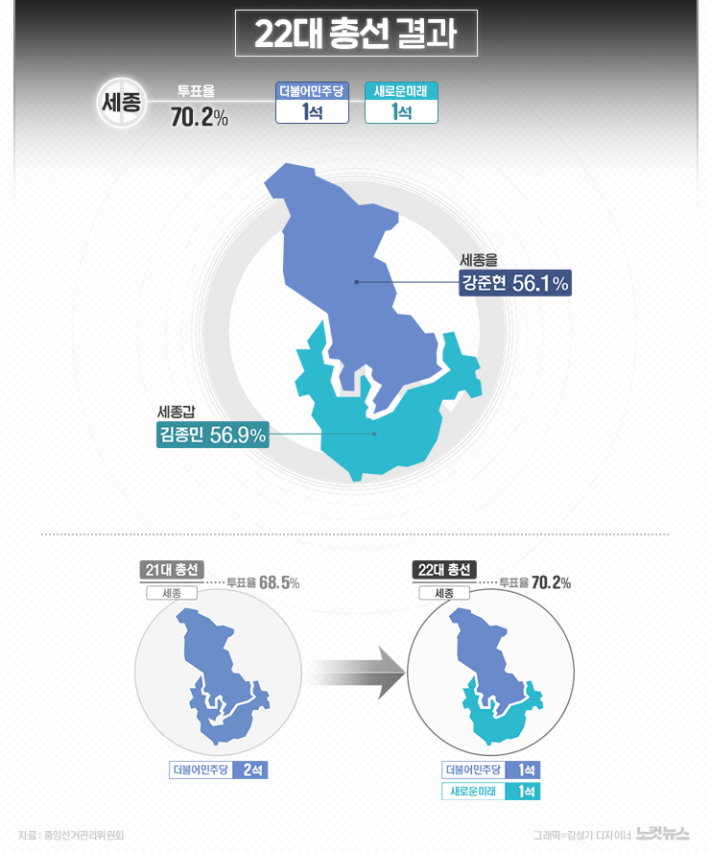 세종 역시 마찬가지다. 국민의힘 소속 최민호 시장 역시 야당 의원들과 시정을 의논해야 한다. 임기 상반기였던 21대 국회에서는 세종갑 홍성국, 세종을 강준현 모두 민주당 소속이었다. 22대에서는 세종갑 김종민 새로운미래, 세종을 강준현 민주당 의원이 당선됐다.