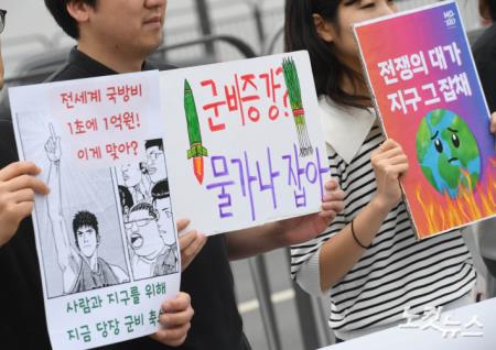 22일 오전 서울 용산구 대통령실 앞에서 열린 '2024 세계군축행동의 날(GDAMS) 기자회견' 에서 시민사회단체 회원들이 군비 축소 및 분쟁국의 무기 수출 중단 등을 촉구하고 있다.