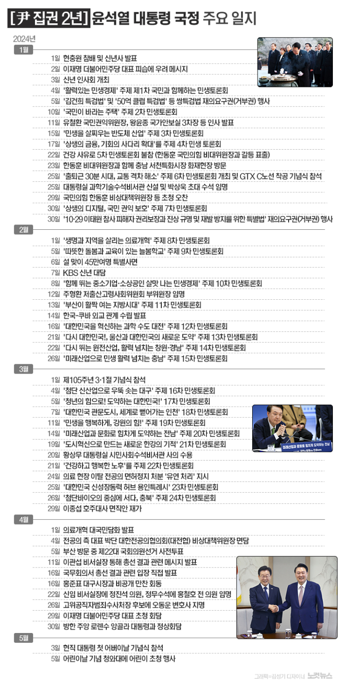 0.7%p 차로 가까스로 집권한 윤석열 정부. 보수 대통령으로서는 처음으로 5.18광주민주화항쟁 기념식에 참석하고 도어스테핑(출근길 문답)을 하는 등 초반에는 참신한 모습을 보였지만 집권내내 '여소야대'의 벽을 넘지 못하고 있다. 지난 2년 동안 윤석열 대통령이 행사한 거부권만 9번에 달해 역대 최다치를 경신했고 야당과의 협치는 더욱 요원해졌다.
