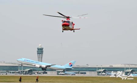 5일 인천국제공항 모형항공기 훈련장에서 레디코리아 2차 훈련이 열리고 있다. 이날 훈련은 착륙 중인 여객기가 돌풍 발생으로 활주로를 이탈, 승객용 버스와 충돌해 화재가 발생한 상황을 가정해 진행됐다.