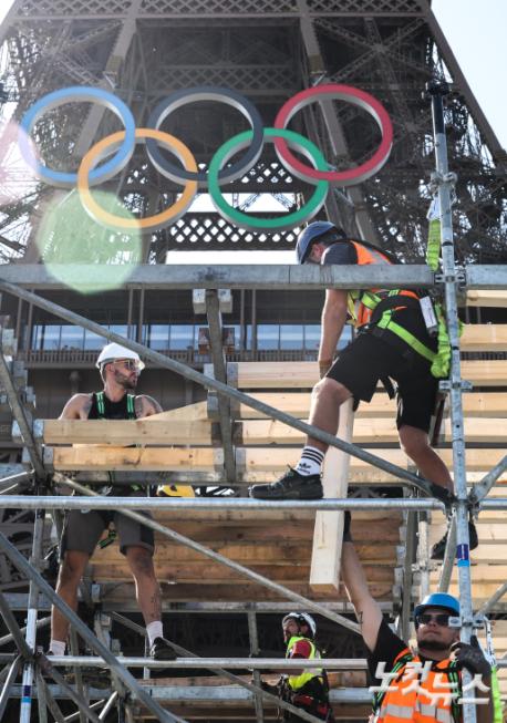2024 파리 올림픽을 8일 앞둔 18일(현지시간) 에펠탑 앞에서 관계자들이 무대 설치 공사 등 개막식 준비를 하고 있다. 2024.7.18 파리=올림픽사진공동취재단