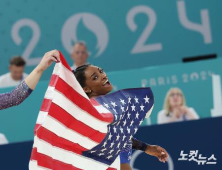 여자 체조의 살아 있는 전설 미국의 시몬 바일스가 1일(현지시간) 프랑스 파리 아레나 베르시에서 열린 기계체조 여자 개인종합 결승에 출전해 금메달을 확정지은 후 성조기를 들고 관중들에게 인사하고 있다. 2024.8.1 파리=올림픽사진공동취재단/JIN