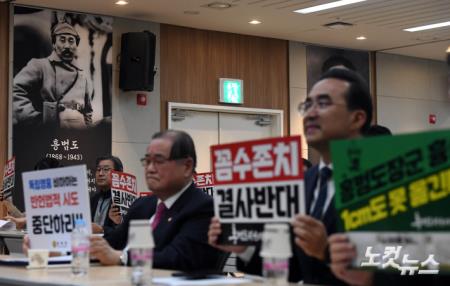 6일 오후 서울 여의도 광복회관에서 열린 ‘육군사관학교 내 독립영웅 흉상 재배치 관련 독립운동단체연합 공동 기자회견’ 참석자들이 손피켓을 들고 구호를 외치고 있다.