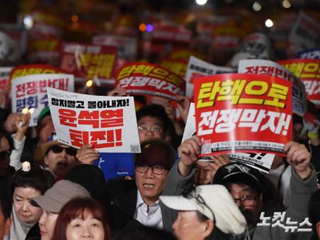 9일 오후 서울 중구 숭례문 앞에서 열린 ‘김건희·윤석열 국정농단 규탄-특검 촉구 제2차 국민행동의 날’ 집회 참가자들이 촛불과 휴대전화 플래시를 켜고 구호를 외치고 있다.